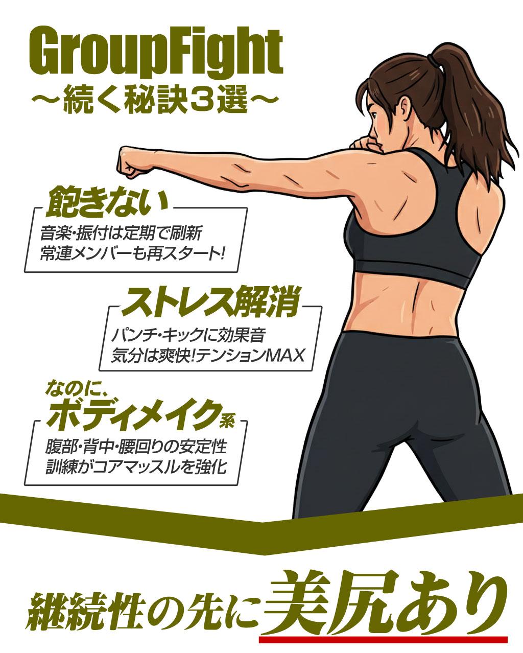 Group Fight®は、「美尻メイク」とストレス発散を同時に叶える夢中&爽快系スタジオプログラム。総合格闘技の動きをベースに動きはシンプルさ重視。音楽とサウンドエフェクトでテンションMAX!脂肪燃焼しながらヒップアップ、全身を動かして心もカラダもスッキリできます。