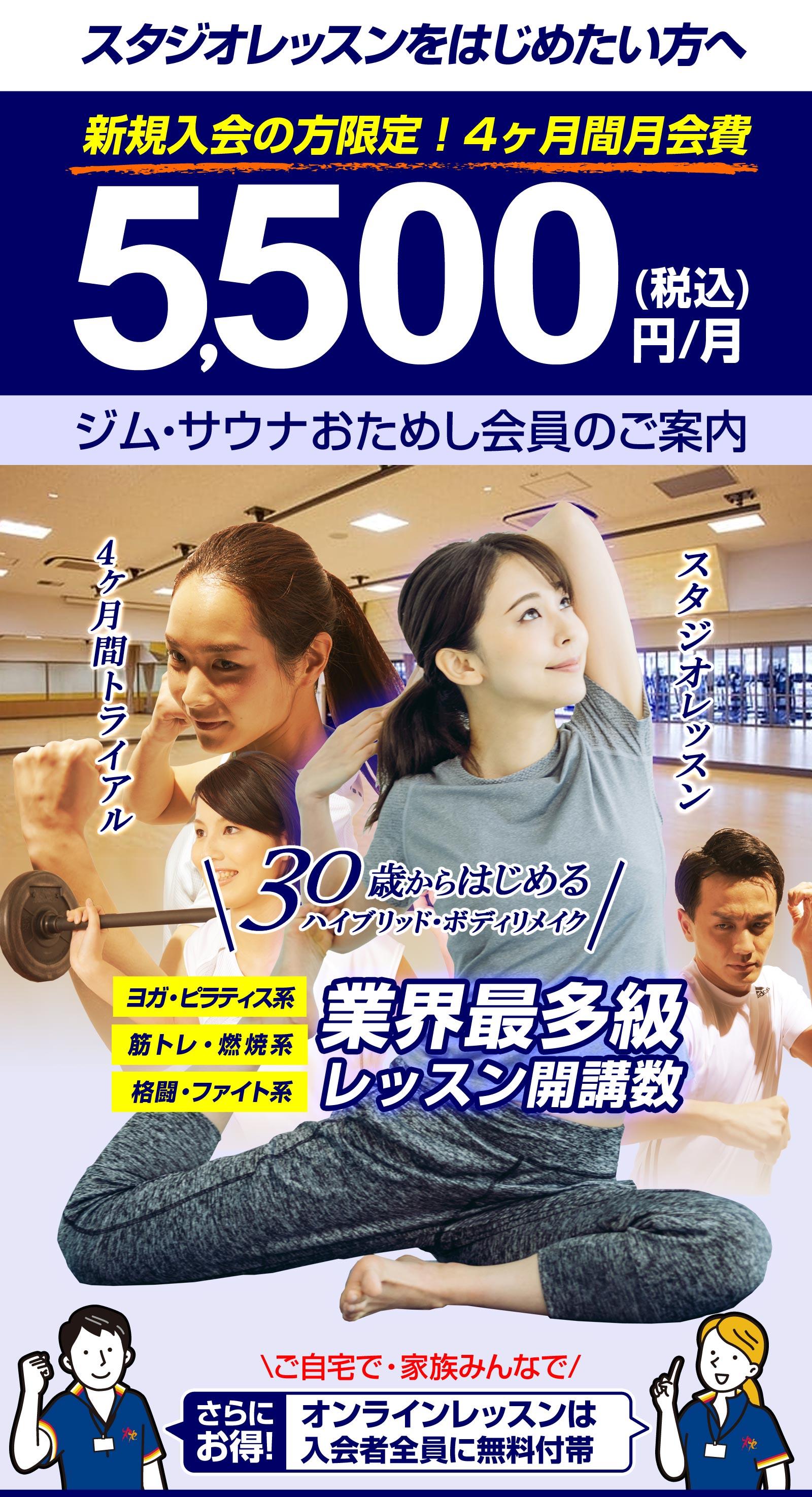 ジム、スタジオレッスン、ロッカールームと付帯の温浴施設(※プール、プールエリアにある設備は利用できません。) |